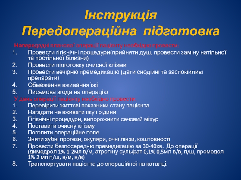 Провести безпосередню премедикацію за 30-40хв. До операції (димедрол 1% 1-2мл в/м, атропіну сульфат 0,1% 0,5мл в/в, п/ш, промедол 1% 2 мл п/ш, в/м, в/в)