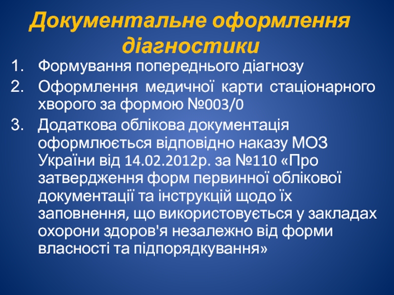 14.02.2012р. за №110 «Про затвердження форм первинної облікової документації та інструкцій щодо їх заповнення, що використовується у закладах охорони здоров'я незалежно від форми власності та підпорядкування»