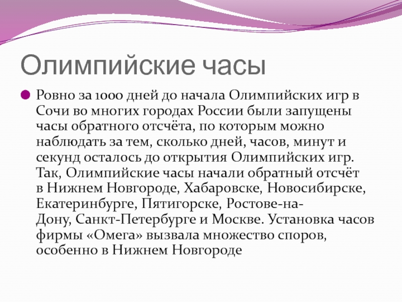 по которым можно наблюдать за тем, сколько дней, часов, минут и секунд осталось до открытия Олимпийских игр. Так, Олимпийские часы начали обратный отсчёт в Нижнем Новгороде, Хабаровске, Новосибирске,Екатеринбурге, Пятигорске, Ростове-на-Дону, Санкт-Петербурге и Москве. Установка часов фирмы «Омега» вызвала множество споров, особенно в Нижнем Новгороде
