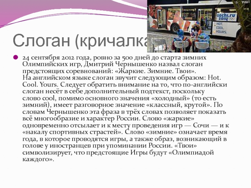 языке слоган звучит следующим образом: Hot. Cool. Yours. Следует обратить внимание на то, что по-английски слоган несёт в себе дополнительный подтекст, поскольку слово cool, помимо основного значения «холодный» (то есть зимний), имеет разговорное значение «классный, крутой». По словам Чернышенко эта фраза в трёх словах позволяет показать всё многообразие и характер России. Слово «жаркие» одновременно отсылает и к месту проведения игр — Сочи — и к «накалу спортивных страстей». Слово «зимние» означает время года, в которое проводятся игры, а также образ, возникающий в голове у иностранцев при упоминании России. «Твои» символизирует, что предстоящие Игры будут «Олимпиадой каждого».