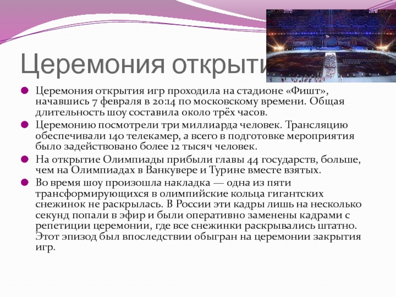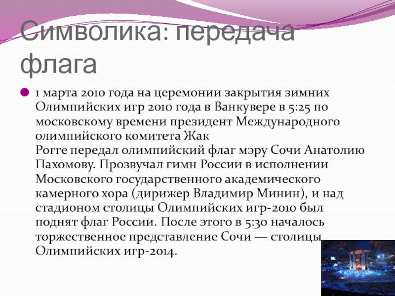 Сочи Анатолию Пахомову. Прозвучал гимн России в исполнении Московского государственного академического камерного хора (дирижер Владимир Минин), и над стадионом столицы Олимпийских игр-2010 был поднят флаг России. После этого в 5:30 началось торжественное представление Сочи — столицы Олимпийских игр-2014.