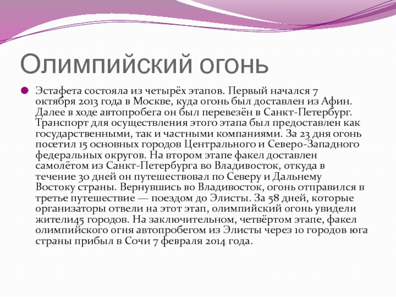 автопробега он был перевезён в Санкт-Петербург. Транспорт для осуществления этого этапа был предоставлен как государственными, так и частными компаниями. За 23 дня огонь посетил 15 основных городов Центрального и Северо-Западного федеральных округов. На втором этапе факел доставлен самолётом из Санкт-Петербурга во Владивосток, откуда в течение 30 дней он путешествовал по Северу и Дальнему Востоку страны. Вернувшись во Владивосток, огонь отправился в третье путешествие — поездом до Элисты. За 58 дней, которые организаторы отвели на этот этап, олимпийский огонь увидели жители45 городов. На заключительном, четвёртом этапе, факел олимпийского огня автопробегом из Элисты через 10 городов юга страны прибыл в Сочи 7 февраля 2014 года.