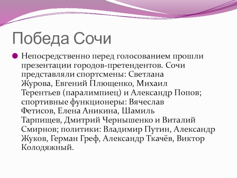 Непосредственно перед голосованием прошли презентации городов-претендентов. Сочи представляли спортсмены: Светлана