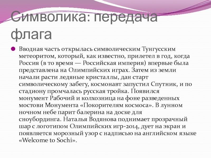была представлена на Олимпийских играх. Затем из земли начали расти ледяные кристаллы, дан старт символическому забегу, космонавт запустил Спутник, и по стадиону промчалась русская тройка. Появился монумент Рабочий и колхозница на фоне разведенных мостови Монумента «Покорителям космоса». В лунном ночном небе парит балерина на доске для сноубординга. Наталья Водянова поднимает прозрачный шар с логотипом Олимпийских игр-2014, дует на экран и появляется морозный узор с надписью на английском языке «Welcome to Sochi».