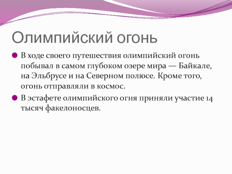 глубоком озере мира — Байкале, на Эльбрусе и на Северном полюсе. Кроме того, огонь отправляли
