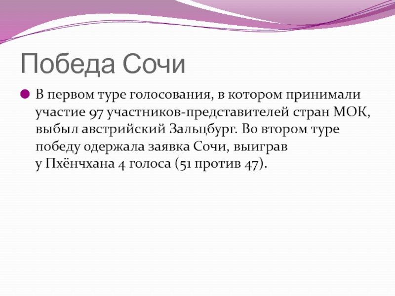 участников-представителей стран МОК, выбыл австрийский Зальцбург. Во втором туре победу одержала заявка Сочи,