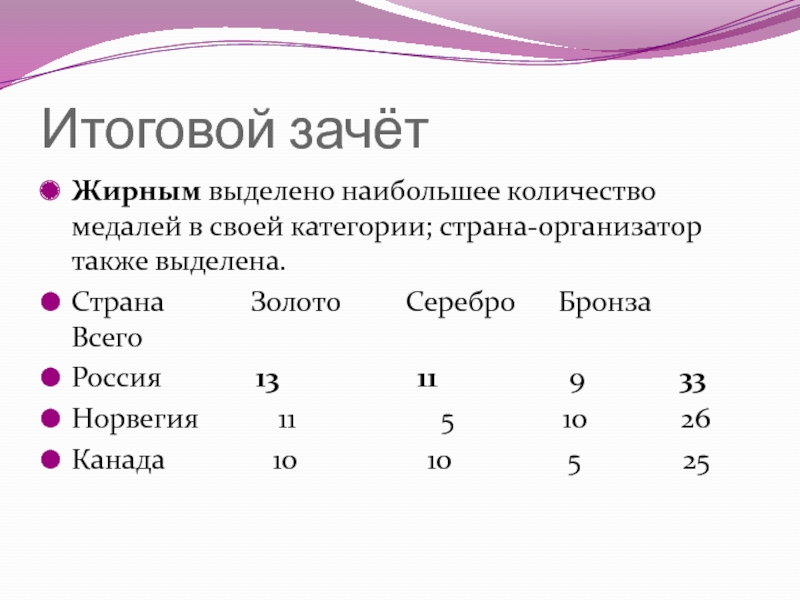 Жирным выделено наибольшее количество медалей в своей категории; страна-организатор также