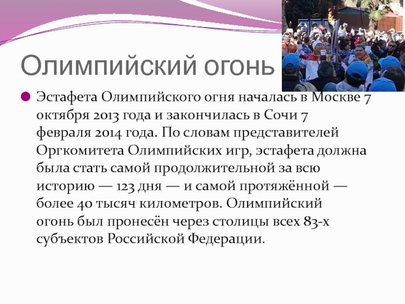 февраля 2014 года. По словам представителей Оргкомитета Олимпийских игр, эстафета должна