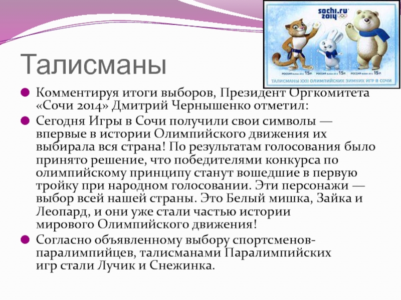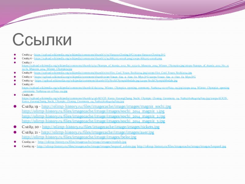 Слайд 7 - https://upload.wikimedia.org/wikipedia/commons/thumb/9/9c/Stamps_of_Russia_2012_No_1559-61_Mascots_2014_Winter_Olympics.jpg/260px-Stamps_of_Russia_2012_No_1559-61_Mascots_2014_Winter_Olympics.jpg