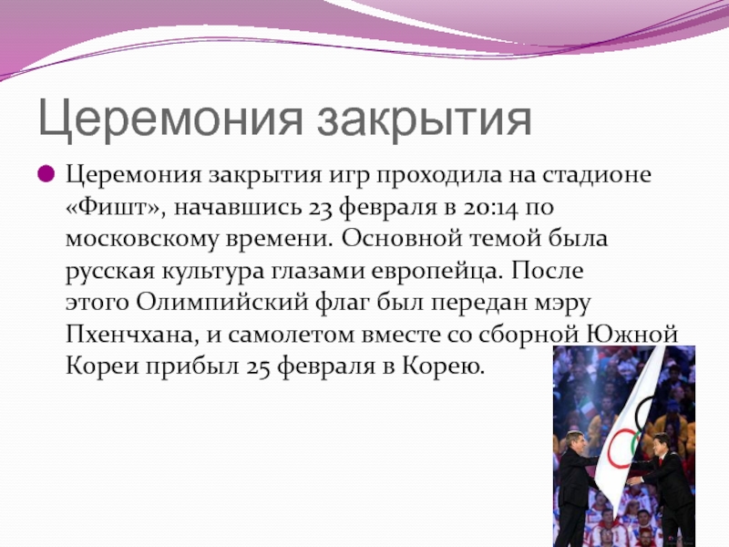 культура глазами европейца. После этого Олимпийский флаг был передан мэру Пхенчхана, и самолетом вместе со сборной Южной Кореи прибыл 25 февраля в Корею.
