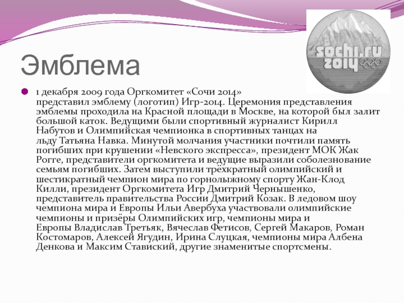1 декабря 2009 года Оргкомитет «Сочи 2014» представил эмблему (логотип) Игр-2014. Церемония представления эмблемы
