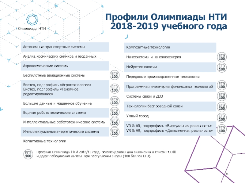 из 13 профилей Олимпиады НТИ позволяет получить 100 баллов ЕГЭ по профильному предмету.