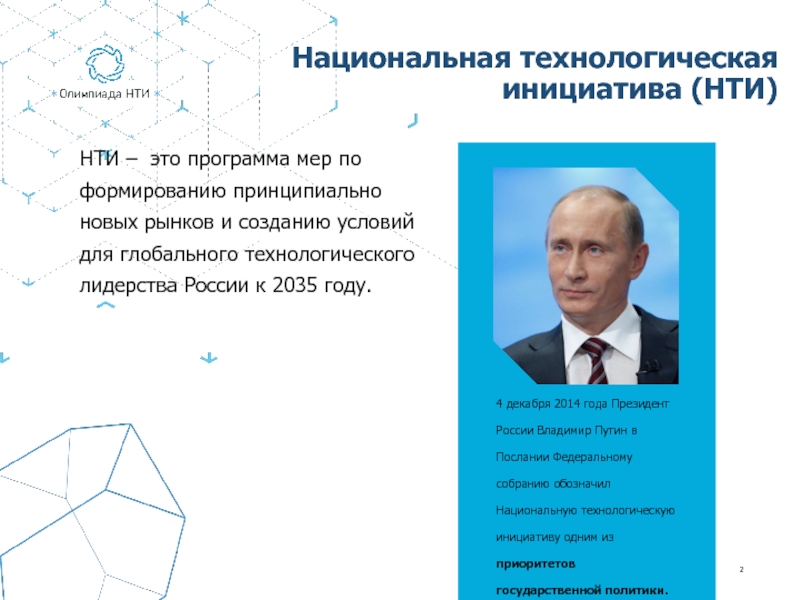 4 декабря 2014 года Президент России Владимир Путин в Послании Федеральному собранию обозначил Национальную технологическую инициативу одним из приоритетов государственной политики.