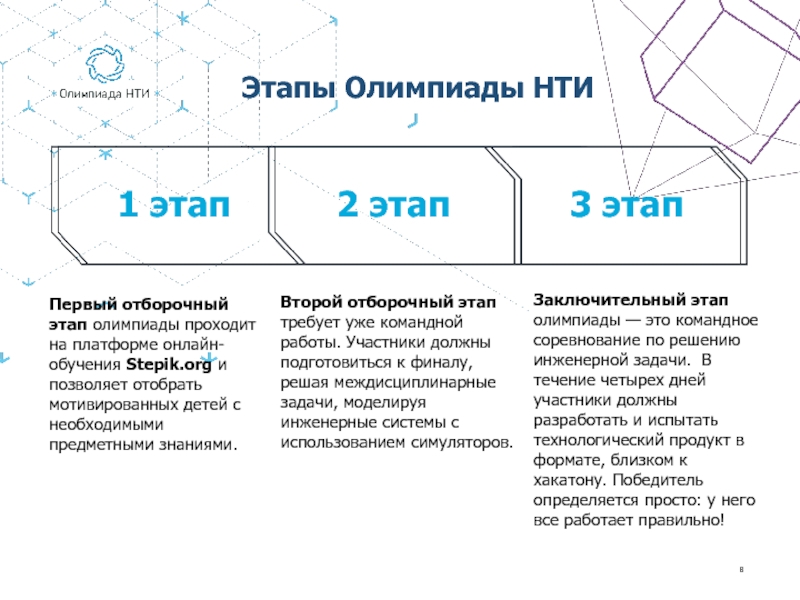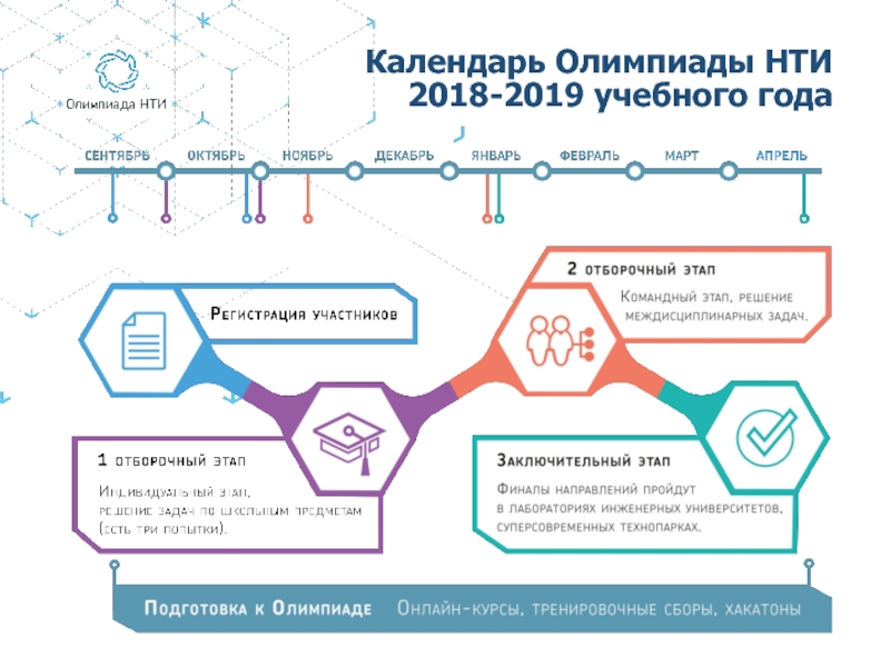 На площадках хакатонов участники посещают лекции, семинары от ведущих отраслевых экспертов, решают в командах упрощенную задачу, предваряющую задание финального этапа Олимпиады.