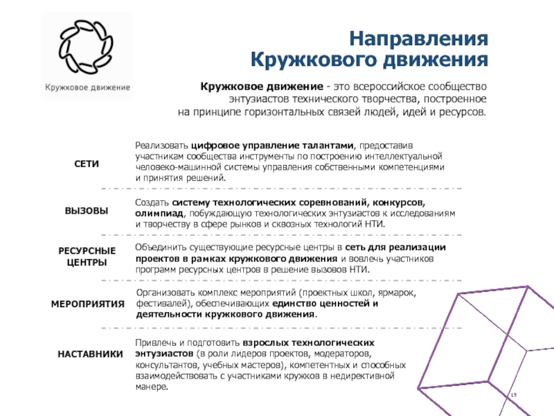 Объединить существующие ресурсные центры в сеть для реализации проектов в рамках кружкового движения и вовлечь участников программ ресурсных центров в решение вызовов НТИ.