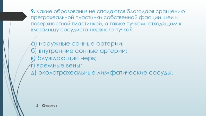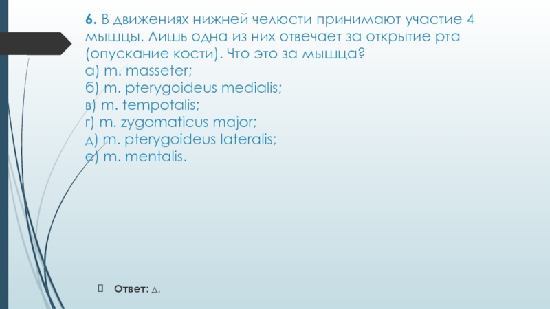 Б) В нем расположены подчелюстные слюнные железы и проходит лицевая артерия и вена, языковой и подъязычный нервы. В пределах этого треугольника осуществляют разрезы при флегмонах дна полости рта, удаляют подчелюстные слюнные железы при новообразованиях и экстирпацию лимфатических узлов при раке языка и губы