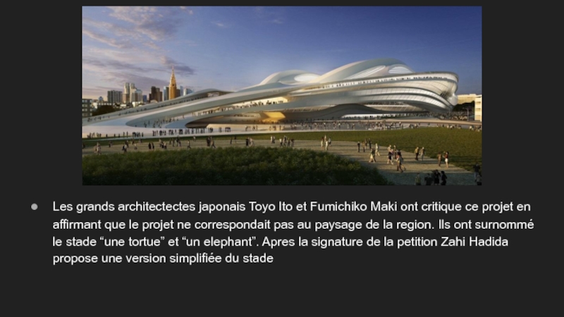 Les grands architectectes japonais Toyo Ito et Fumichiko Maki ont critique ce projet en affirmant que le