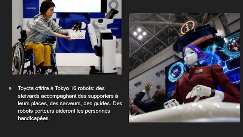 Слайд 9Toyota offrira à Tokyo 16 robots: des steivards accompaghant des