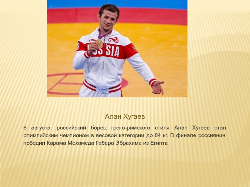 категории до 60 кг одолел в финале японца Хироаки Хираока. Таким образом, Галстян стал первым российским обладателем медали Олимпийских игр 2012 года.