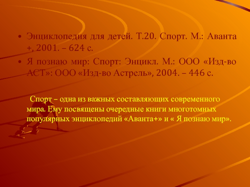 Слайд 14Энциклопедия для детей. Т.20. Спорт. М.: Аванта +, 2001. –
