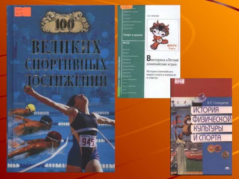 Горбунов В. В. Викторина «Летние олимпийские игры»: история олимпийских видов спорта в вопросах и ответах. М.: изд-во «Чистые пруды», 2008. – 32 с.