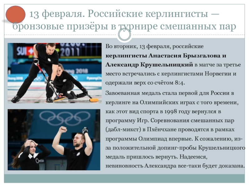 Завоеванная медаль стала первой для России в керлинге на Олимпийских играх с того времени, как этот вид спорта в 1998 году вернулся в программу Игр. Соревнования смешанных пар (дабл-микст) в Пхёнчхане проводятся в рамках программы Олимпиад впервые. К сожалению, из-за положительной допинг-пробы Крушельницкого медаль пришлось вернуть. Надеемся, невиновность Александра все-таки будет доказана.