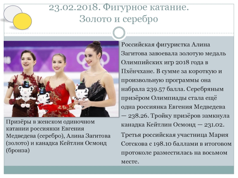 за короткую и произвольную программы она набрала 239.57 балла. Серебряным призёром Олимпиады стала ещё одна россиянка Евгения Медведева — 238.26. Тройку призёров замкнула канадка Кейтлин Осмонд — 231.02.