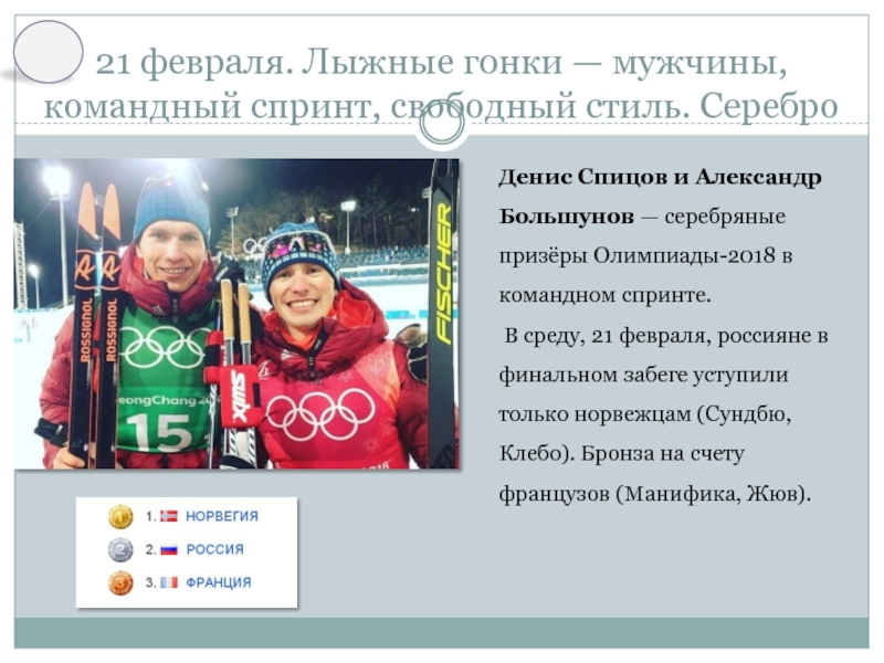 В среду, 21 февраля, россияне в финальном забеге уступили только норвежцам (Сундбю, Клебо). Бронза на счету французов (Манифика, Жюв).