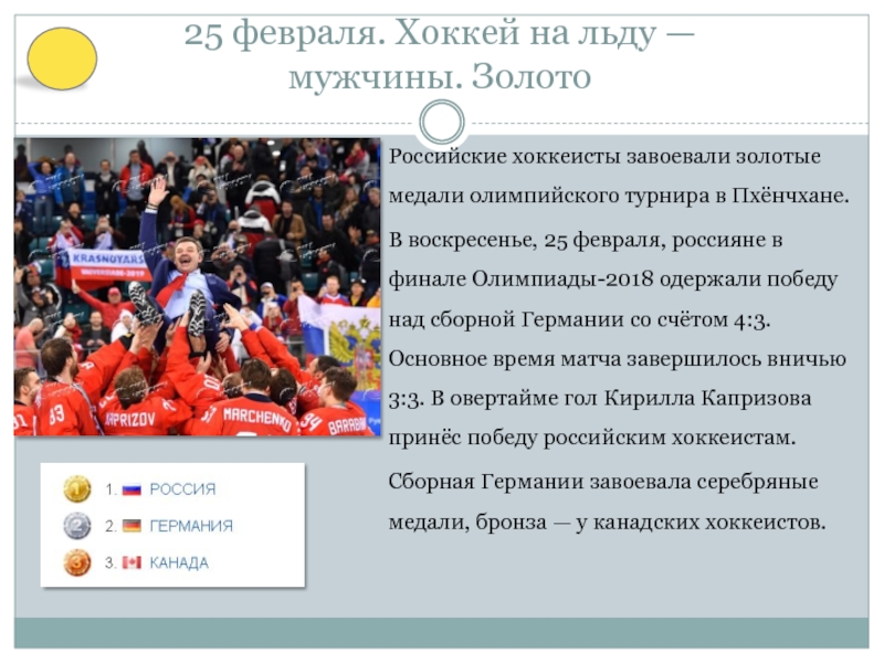 в финале Олимпиады-2018 одержали победу над сборной Германии со счётом 4:3. Основное время матча завершилось вничью 3:3. В овертайме гол Кирилла Капризова принёс победу российским хоккеистам.
