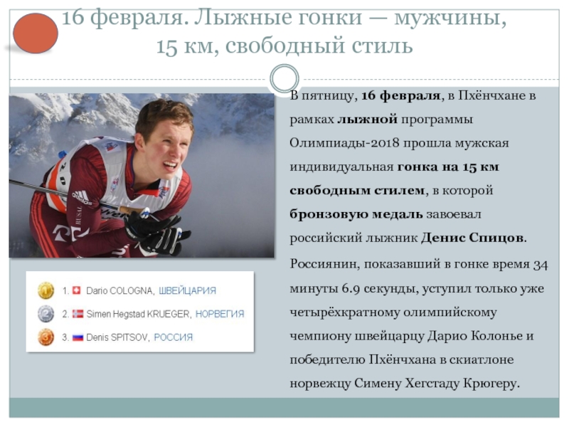 прошла мужская индивидуальная гонка на 15 км свободным стилем, в которой бронзовую медаль завоевал российский лыжник Денис Спицов.