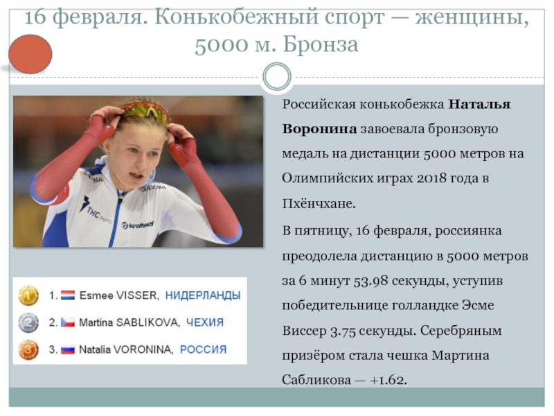 В пятницу, 16 февраля, россиянка преодолела дистанцию в 5000 метров за 6 минут 53.98 секунды, уступив победительнице голландке Эсме Виссер 3.75 секунды. Серебряным призёром стала чешка Мартина Сабликова — +1.62.