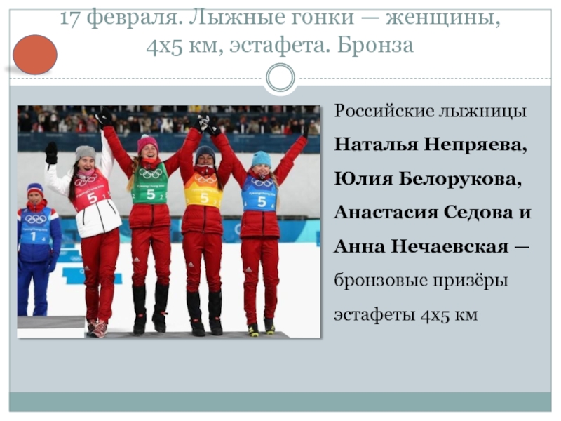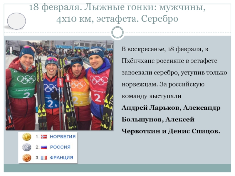 18 февраля, в Пхёнчхане россияне в эстафете завоевали серебро, уступив