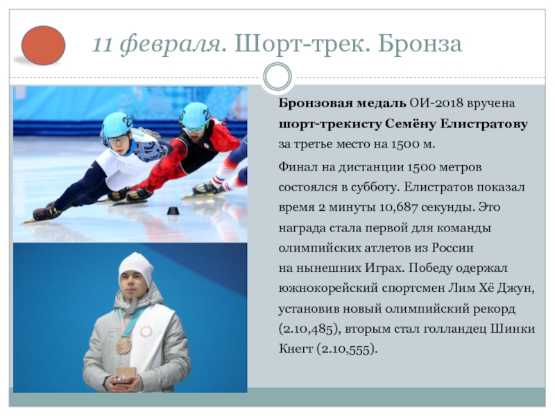 10,687 секунды. Это награда стала первой для команды олимпийских атлетов из России на нынешних Играх. Победу одержал южнокорейский спортсмен Лим Хё Джун, установив новый олимпийский рекорд (2.10,485), вторым стал голландец Шинки Кнегт (2.10,555).