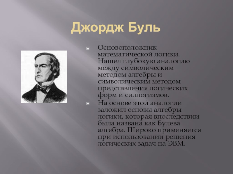 этой аналогии заложил основы алгебры логики, которая впоследствии была названа как Булева алгебра. Широко применяется при использовании решения логических задач на ЭВМ.
