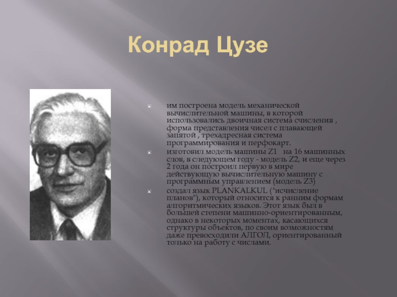 создал язык PLANKALKUL ("исчисление планов"), который относится к ранним формам алгоритмических языков. Этот язык был в большей степени машинно-ориентированным, однако в некоторых моментах, касающихся структуры объектов, по своим возможностям даже превосходили АЛГОЛ, ориентированный только на работу с числами.