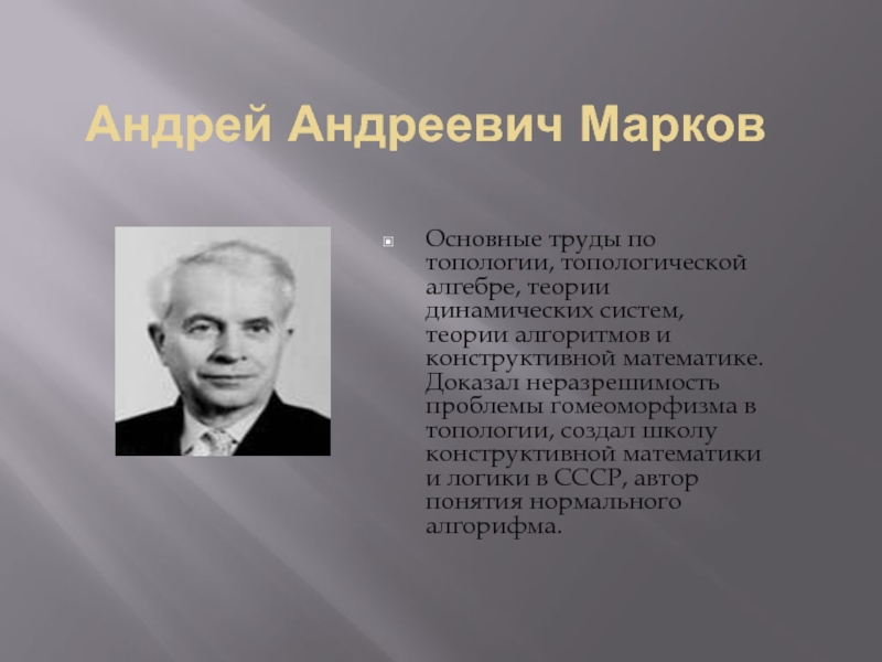в топологии, создал школу конструктивной математики и логики в СССР, автор понятия нормального алгорифма.