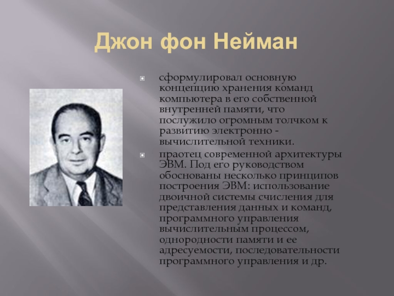 праотец современной архитектуры ЭВМ. Под его руководством обоснованы несколько принципов построения ЭВМ: использование двоичной системы счисления для представления данных и команд, программного управления вычислительным процессом, однородности памяти и ее адресуемости, последовательности программного управления и др.