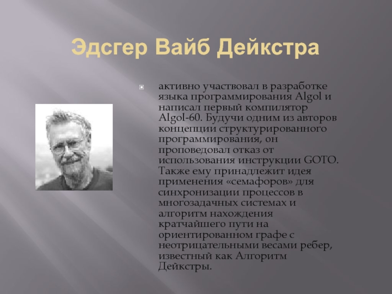 программирования, он проповедовал отказ от использования инструкции GOTO. Также ему принадлежит идея применения «семафоров» для синхронизации процессов в многозадачных системах и алгоритм нахождения кратчайшего пути на ориентированном графе с неотрицательными весами ребер, известный как Алгоритм Дейкстры.