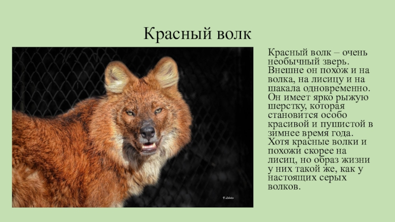 имеет ярко рыжую шерстку, которая становится особо красивой и пушистой в зимнее время года. Хотя красные волки и похожи скорее на лисиц, но образ жизни у них такой же, как у настоящих серых волков.