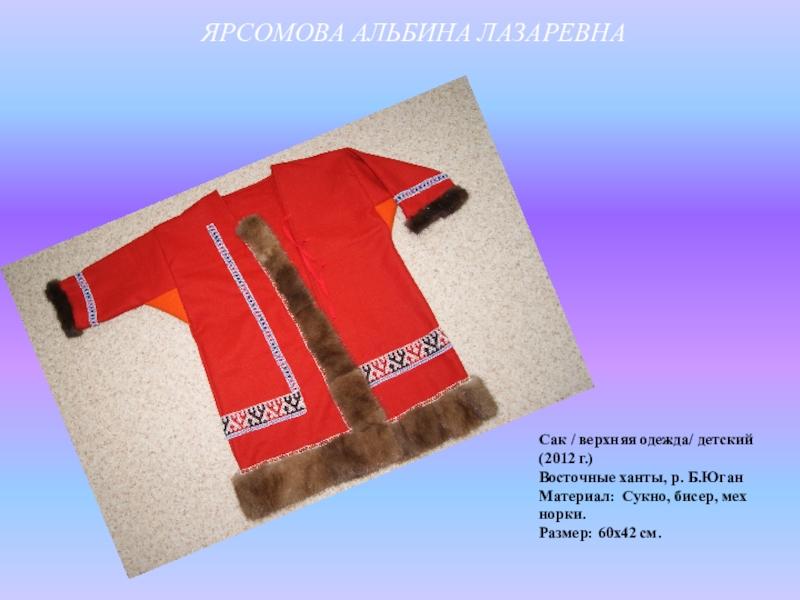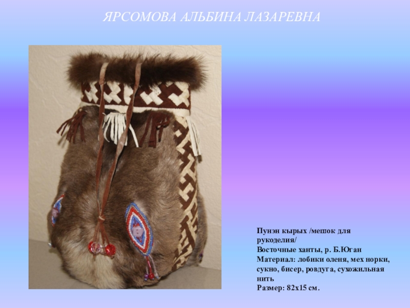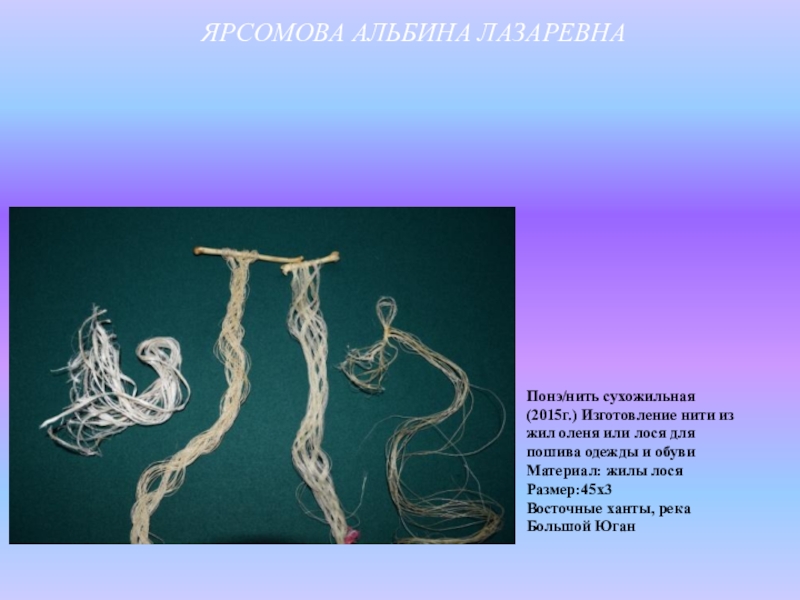сухожильные, краситель из коры лиственницы, мех соболя.