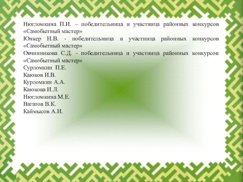 Слайд 4Нюгломкина П.И. – победительница и участница районных конкурсов «Самобытный мастер»