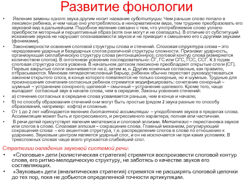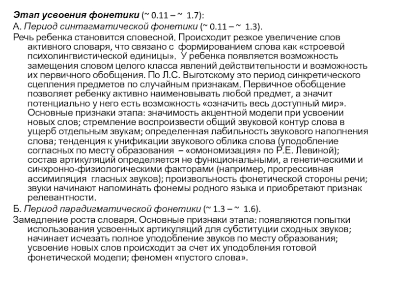 резкое увеличение слов активного словаря, что связано с формированием слова как «строевой психолингвистической единицы». У ребенка появляется возможность замещения словом целого класса явлений действительности и возможность их первичного обобщения. По Л.С. Выготскому это период синкретического сцепления предметов по случайным признакам. Первичное обобщение позволяет ребенку активно наименовывать любой предмет, а значит потенциально у него есть возможность «означить весь доступный мир». Основные признаки этапа: значимость акцентной модели при усвоении новых слов; стремление воспроизвести общий звуковой контур слова в ущерб отдельным звукам; определенная лабильность звукового наполнения слова; тенденция к унификации звукового облика слова (уподобление согласных по месту образования – «омономизация» по Р.Е. Левиной); состав артикуляций определяется не функциональными, а генетическими и синхронно-физиологическими факторами (например, прогрессивная ассимиляция гласных звуков); произвольность фонетической стороны речи; звуки начинают напоминать фонемы родного языка и приобретают признак релевантности.