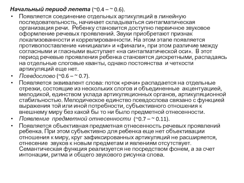 Слайд 12Начальный период лепета (~0.4 – ~ 0.6).