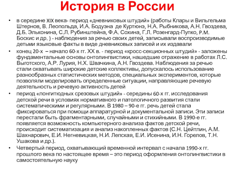 конец 20-х – начало 60-х гг. ХХ в. - период «кросс-секционных штудий» - заложены фундаментальные основы онтолингвистики, нашедшие отражение в работах Л.С. Выготского, А.Р. Лурия, Н.Х. Швачкина, А.Н. Гвоздева. Наблюдения за речью стали охватывать широкие детские коллективы, допускалось использование разнообразных статистических методов, специальных экспериментов, которые позволяли моделировать определенные ситуации, направляющие речевую деятельность и речевую активность детей
