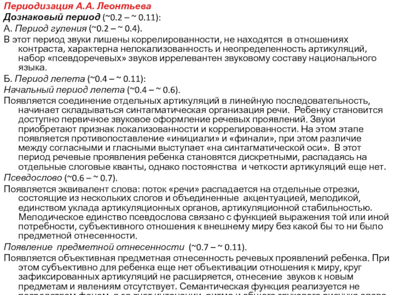 Появляется эквивалент слова: поток «речи» распадается на отдельные отрезки, состоящие из нескольких слогов и объединенные акцентуацией, мелодикой, единством уклада артикуляционных органов, артикуляционной стабильностью. Мелодическое единство псевдослова связано с функцией выражения той или иной потребности, субъективного отношения к внешнему миру без какой бы то ни было предметной отнесенности.