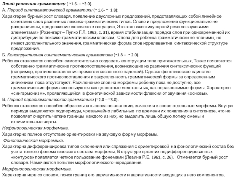 представляющих собой линейное сочетание слов различных лексико-грамматических типов. Слово и предложение функционально не разграничены, предложение включено в ситуацию. Это этап «жестикулярной речи со звуковыми элементами» (Розенгарт – Пупко Г.Л. 1963, с. 31), время стабилизации порядка слов при одновременной их дистрибуции по лексико-грамматическим классам. Слова для ребенка грамматически не членимы, не имеют дополнительного значения, грамматическая форма слов иррелевантна синтаксической структуре предложения.