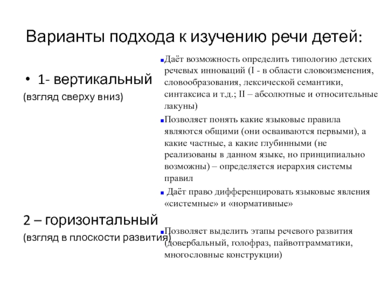 Позволяет выделить этапы речевого развития (довербальный, голофраз, пайвотграмматики, многословные конструкции)