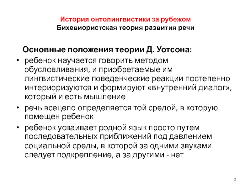 ребенок усваивает родной язык просто путем последовательных приближений под давлением социальной среды, в которой за одними звуками следует подкрепление, а за другими - нет