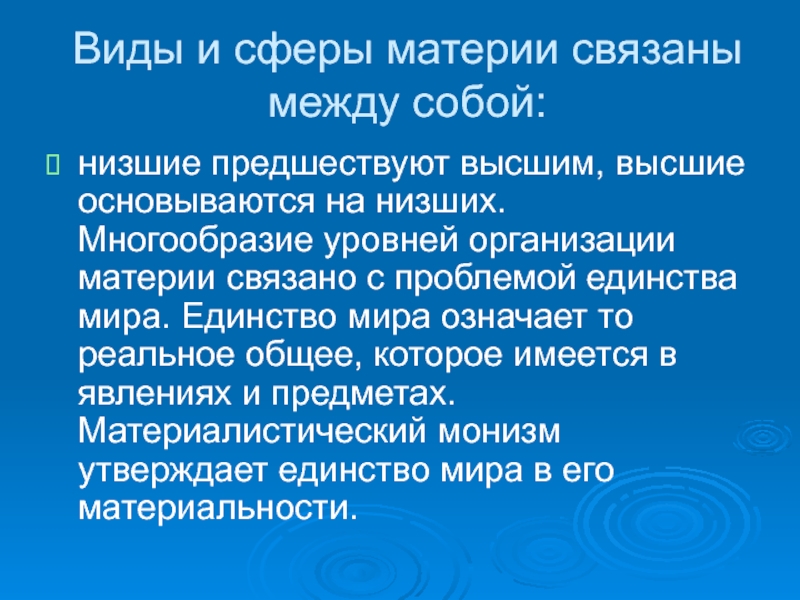 единства мира. Единство мира означает то реальное общее, которое имеется в явлениях и предметах. Материалистический монизм утверждает единство мира в его материальности.
