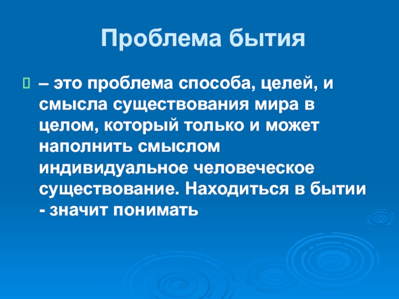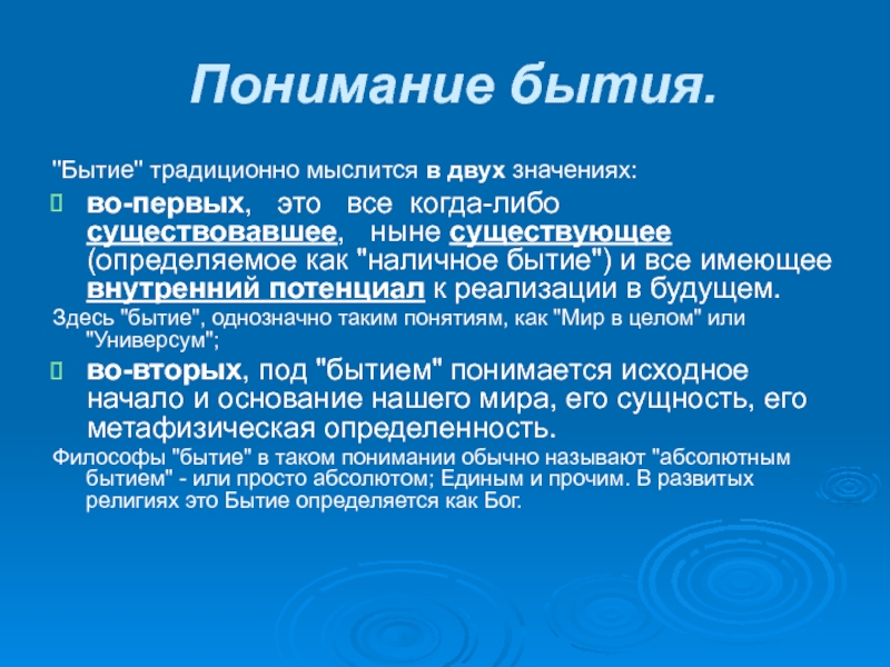 во-вторых, под "бытием" понимается исходное начало и основание нашего мира, его сущность, его метафизическая определенность.